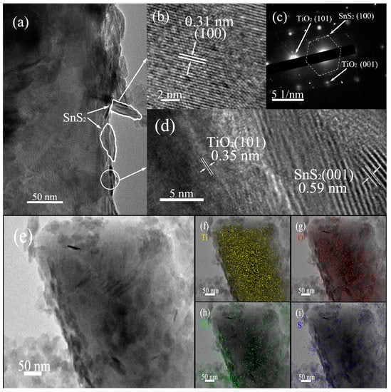 Figure 4a shows the typical TEM images of SnS2/TiO2-B. From Figure 4a, it can be seen that SnS2 nanosheets grow flatly or vertically on the TiO2-B the surface. Furthermore, a high-resolution TEM image of SnS2 nanosheets (Figure 4b) displays the inter-planar distance of 0.31 nm, which is consistent with that of SnS2 {100} plane [33]. The selected area electron diffraction (SEAD) pattern (Figure 4c) reveals the presence of both TiO2 and SnS2 crystals in the heterostructure SnS2/TiO2-B, and a single-crystalline TiO2-B with co-exposed {101} and {001} facets [12,27,34]. In addition, the magnified HRTEM image (Figure 4d) of the interface region clearly displays the interplanar distances of 0.35 and 0.59 nm, corresponding to the {101} plane of TiO2 and the {001} plane of SnS2, respectively. What’s more, the TEM elemental mapping of SnS2/TiO2-B has been performed to identify the spatial distributions of elements Ti, O, Sn and S, as shown in Figure 4e–i. It is indicated that the elements Sn, S evenly distribute on a support consisting of densely distributed Ti, O elements. The above results clearly demonstrate that the TiO2-B nanoplate surfaces are coated by SnS2 and the interface heterojunction forms between TiO2-B and SnS2. The tight heterojunction structure of SnS2/TiO2-B would benefit the interfacial charge transfer spatially, and thereby increase the photocatalytic activity [35].