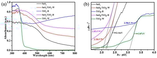 where α, h, ν, B, and Eg are the absorption coefficient, discrete photon energy, a constant and band gap, respectively. Herein, the value of x depends on the characteristics of the transition in a semiconductor: 2 for SnS2 and 1/2 for TiO2 based on the definition of direct transition semiconductor (x = 2) and indirect transition semiconductor (x = 1/2), respectively. Taking hν as the abscissa axis and (αhν)x as the ordinate axis, the corresponding plots are obtained. As shown in Figure 6b, the band gap values of SnS2 and TiO2-W are evaluated to be 2.14 and 3.07 eV, respectively, which are consistent with the reported values [27,44]. In comparison with TiO2-W, TiO2-B shows much narrower the band gap of 2.50 eV, owing to the presence of Ti3+ state lying below the conduction band of TiO2. What’s more, both SnS2/TiO2-B and SnS2/TiO2-W present even much narrower band gaps of 2.05 and 2.18 eV, respectively. The narrowest band gap of SnS2/TiO2-B among these test samples should be ascribed to the synergistic effects resulting from both high-density state of Ti3+ and the formation of heterojunction structure between SnS2/TiO2-B, which would improve the photocatalytic activity under visible light irradiation.