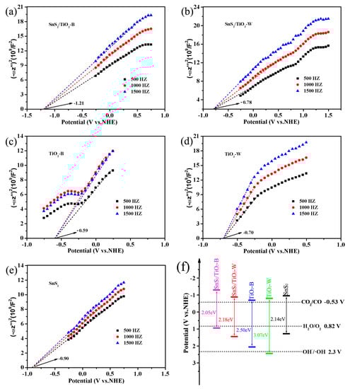 The Mott−Schottky measurements have been performed to calculate the energy band positions (ECB for conduction band and EVB for valence band) of samples SnS2/TiO2-B, SnS2/TiO2-W, TiO2-B, TiO2-W, and SnS2. The conduction band potential of a sample can be calculated through the intersection value of the linear part of its MS curve and the abscissa axis [45]. As shown in Figure 7a–e, the slopes of the MS curves for all samples are positive, indicating that they are n-type semiconductors. By fitting the obtained MS curves, the ECB values of SnS2/TiO2-B, SnS2/TiO2-W, TiO2-B, TiO2-W, and SnS2 are evaluated to be −1.21, −0.78, −0.59, −0.70, −0.90 eV, respectively. Furthermore, the valence band positions of samples can be estimated by the formula (EVB = Eg + ECB) [46]. Accordingly, the EVB values of SnS2/TiO2-B, SnS2/TiO2-W, TiO2-B, TiO2-W, and SnS2 are obtained as 0.84, 1.40, 2.00, 2.37, 1.24 eV, respectively. Based on the above results, the band structures of these samples are summarized in Figure 7f. It is indicated that the conduction band potentials of all samples are located above CO2/CO redox potential, which mean that after the electrons in the valence band of the semiconductor are excited by the photons to the conduction band, the electrons on the conduction band can transition to the CO2 molecules adsorbed on the surface of the catalyst to carry out the reduction reaction [45,47]. However, from a kinetics point of view, it is, in fact, critical to providing an overpotential, that is, there should be substantial margins over the reduction potential of CO2. Without an overpotential, even a good catalyst would not ensure a high rate of reaction [38]. Obviously, among these samples, SnS2/TiO2-B shows the highest conduction band potential and enough wide band gap spanning the range of the reduction and oxidation potentials, suggesting its strongest reduction ability to convert CO2 to CO under light irradiation [48].