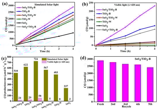 CO production over different photocatalysts (a) under simulated solar light and (b) visible light (λ > 420 nm) irradiation, (c) Comparison of average CO production rates of all samples and (d) Stability test of SnS2/TiO2-B under simulated solar light irradiation.