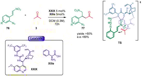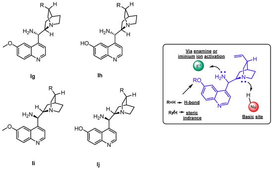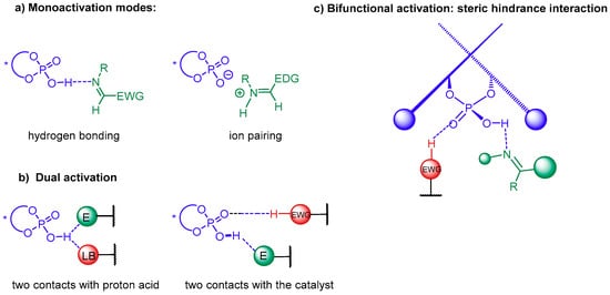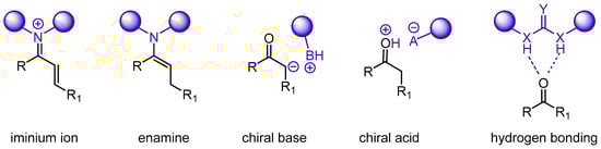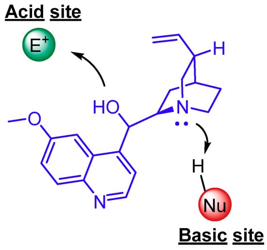 An incredible range of organocatalysts capable of promoting enantioselective reactions were found, enabling transformations thanks to different activations, via iminium ion or enamine activation [], via protonation or deprotonation (chiral basic [] or acidic catalysts []), coordination via hydrogen bond [,], and via steric hindrance [,,] (Figure 1). The combination of the different activations in one catalyst to interact with different reaction partners is noteworthy; a bifunctional, or multifunctional, catalyst is a molecule which exhibits more than one functional group capable of interacting and orientating with two different substrates during a catalytic process [].