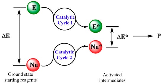 The activated species can rapidly react, making reactions possible that would otherwise be inefficient or even impossible with traditional mono-catalysis methods. The reaction between two intermediates present in low sub-stoichiometric concentrations should be, in principle, difficult; however, considering kinetic aspects, the reaction between two activated intermediates should be promising due to the narrowing of the HOMO-LUMO, which causes a large decrease in the activation energy and, as a consequence, increases the rate constant to drive the desired synthetic pathway.