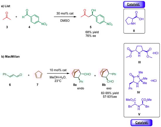 In hindsight, the results obtained were a breakthrough as it was the first use of a small organic molecule as a catalyst. For several reasons, however, asymmetric organocatalysis was not born; it was probably only at the beginning of the new millennium that the field was mature enough to bloom. This is testified by the fact that two ground breaking pioneers in the field of organic chemistry, Benjamin List [] (Scheme 2a) and David MacMillan [] (Scheme 2b), simultaneously reported two different, albeit complementary, activations with aminocatalysts, giving birth to a “Gold Rush” in organocatalysis []. In particular, their studies highlighted the possibility of carrying out asymmetric reactions with organocatalysts based on enamine or iminium ion or activation.