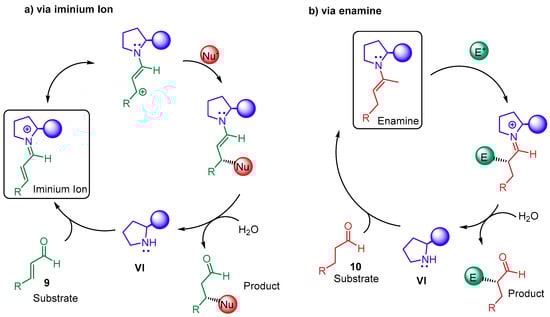 Proline activation modes: (a) via iminium ion, (b) via enamine.