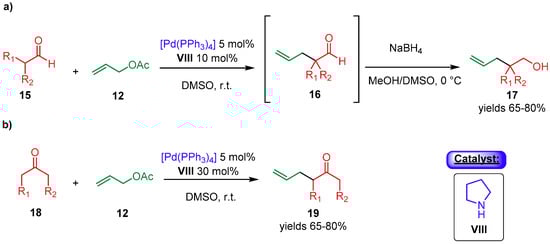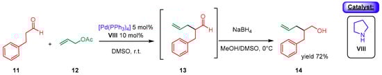 The combination of transition metal catalysis and organocatalysis gained increasing recognition, improving several reactions []. One of the first groundbreaking examples of metal- and organo-catalysis working in concert was reported by the Cordova research group in 2006 []. They proposed a direct catalytic allylic alkylation of aldehydes and cyclic ketones. The intermolecular α-allylic alkylation reaction, which has the advantage of being highly chemo- and regio-selective, was performed through an unprecedented combination of palladium and enamine mediated catalysis. They described the reaction of 3-phenylpropionaldehyde (11, 3 equiv.) with allyl acetate (12, 1 equiv.) in the presence of a catalytic amount of palladium catalyst [Pd(PPh3)4] (5 mol%) and pyrrolidine VIII (10 mol%) in dimethyl sulfoxide at room temperature. The corresponding α-benzylic alcohol 14 was isolated in 72% yield after 16 h by reduction with NaBH4 of the α-allylic alkylated aldehyde 13 (Scheme 4).
