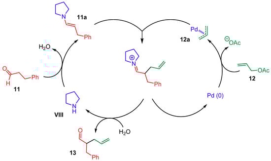 Merging two powerful catalytic cycles enables both electrophilic and nucleophilic activation. As depicted in Scheme 5, the C–C bond formation is allowed by the catalytic enamine intermediate 11a generated in situ, which attacks the catalytically generated electrophilic palladium π-allyl complexes 12a. Reductive elimination and subsequent hydrolysis of the iminium intermediate regenerates the Pd(0) and the amine catalyst VIII, and yields the α-allylic alkylated aldehyde 13.