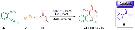 Since then, several synergistic catalytic approaches based on transition metal catalysis and aminocatalysis were developed. Prompted by the great results obtained through synergistic catalysis and their growing interest in natural product-like compound synthesis [,,]. Wu et al. described a novel and promising one-pot combination of silver triflate and proline catalysis provided an efficient route for the synthesis of 1,2-dihydroisoquinoline derivatives 22 via multicomponent reactions of 2-alkynylbenzaldehydes 20, amines 21, and ketones 18 [] (Scheme 7).