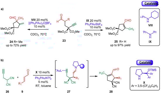 Together with silver, gold was used as the metal partner. The first example of Au(I)-enamine synergistic catalysis was reported in 2008 by Kirsh et al. []. The authors performed a cyclisation of the alkyne aldehydes 23 to 24 or 25 providing racemic products with excellent yields (Scheme 8a). The proposed mechanism features a simultaneous enamine formation at the terminal aldehyde and a π-acid activation at the triple bond. This protocol, however, comes with an inherent challenge: If R is H, the Au(I)-catalysed cyclisation results in an exocyclic terminal alkene after protodeauration, which spontaneously isomerizes to the thermodynamically more stable compound 25. This isomerization removes the new stereogenic center created during the carbon-carbon bond formation step. If R is a methyl group, a quaternary stereocenter bearing product 24 is created in up to 72% yield. An enantioselective version of this reaction was later reported by Jørgensen et al. (Scheme 8b) []. They exploited the sterically bulky Jørgensen-Hayashi catalyst X to induce the attack of 26 to an α,β-unsaturated aldehyde 9 via iminium-ion activation. The first Michael addition creates an intermediate, which undergoes synergistic enamine/Au(I) catalysis to obtain the carbocyclisation reaction with high enantio-enrichment of 28 in good to excellent yields.