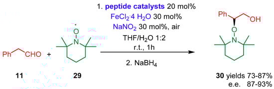 The oxyamination of 3-phenylpropanal 11 is performed with TEMPO 29 using iron(III) chloride in the presence of the peptide catalyst. The reaction is carried out in THF/H2O 1/2 (v/v) at room temperature; increasing the amount of water in the system THF/H2O from 1/1 to 1/2 increases the hydrophobic effect and causes an acceleration of the desired product formation. The best results were obtained by introducing a polyleucine chain between the terminal prolyl residue of peptide catalyst and its support. This structural change enhances the reaction rate and increases the enantioselectivity [].