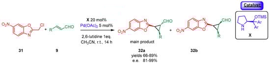 Based on this concept, in 2018 Rios et al. reported the first synergistic organocascade reaction for the synthesis of cyclopropanes 32 with an unusual cis configuration between the benzoxazole and the substituted phenyl ring with good yields and steroselectivities [] (Scheme 10).