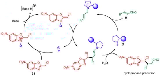 The reaction proceeds via a simultaneous organocatalytic activation of enals with a secondary amine catalyst and the metal Lewis acid-based activation of benzoxazoles; the stereocontrol in this protocol is imparted by the chiral organocatalyst, thus avoiding the need of expensive chiral ligands for the metal. The palladium catalyst coordinates to the nitrogen atom of the heterocycle, increasing the acidity of the adjacent alkyl chain, while the Jørgensen-Hayashi catalyst X activates the enals, generating an electrophilic iminium-ion intermediate; these two species can then react rapidly to generate a new C–C bond in the cyclopropane precursor (Scheme 11).