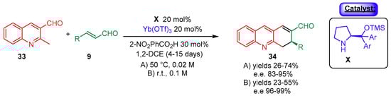 The same research group reported another interesting example by merging organocatalysis via iminium-ion with ytterbium-based metal catalysis to prepare dihydroacridines []. The reaction proceeds via the activation of quinolines derivatives 33 with Yb(OTf)3 and the concurrent enals activation via iminium-ion by the TMS-protected diaryl prolinol X (Scheme 12).