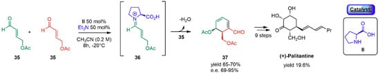 The reaction is a formal self-dimerization [4 + 2] addition of (E)-4-acetoxycrotonaldehyde activated by L-proline in presence of a trialkyl amine as a co-catalyst. Given the type of reaction, the pathway can only evolve if the reagent is activated in two different ways by the same catalyst. This is, fortunately, the case, given the complementary types of activation that proline can effect. While one aldehyde is activated via an electrophilic iminium-ion intermediate, the other one proceeds through a nucleophilic dienamine intermediate. At this point, the electronic rearrangement will produce the intermediate compound 37 with the formation of two new C–C bonds. Triethylamine was added as a co-catalyst to improve the reaction time and the yield; this way, the reaction could be carried out at a lower temperature, providing a higher enantiomeric excess.