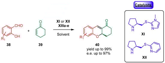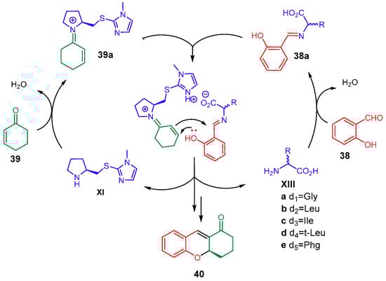 The amino acid, a primary amine, condenses with salicylaldehyde 38 to form imine 38a. A proline derivative XI generates an iminium-ion intermediate reacting with cyclohexenones 39 (Scheme 15). The intermediates formed with the two different catalysts can then react via an oxa-Michael-Mannich reaction. The depicted transition state was confirmed by Fourier-transform ion cyclotron resonance mass spectroscopy.