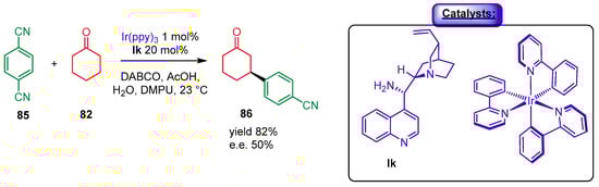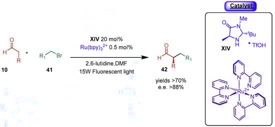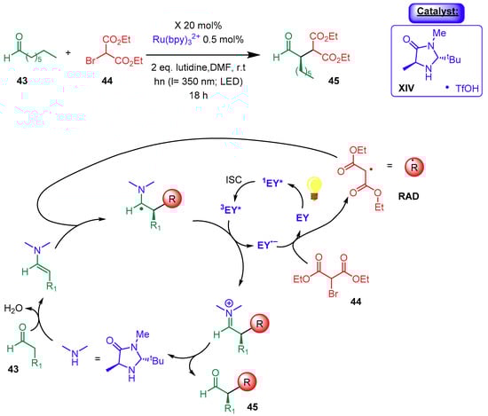 The same reaction of α-alkylation of aldehydes was proposed by Zeitler et al. in 2011, using a metal-free cooperative asymmetric organophotoredox catalysis approach mediated by luminescent organic dyes [].