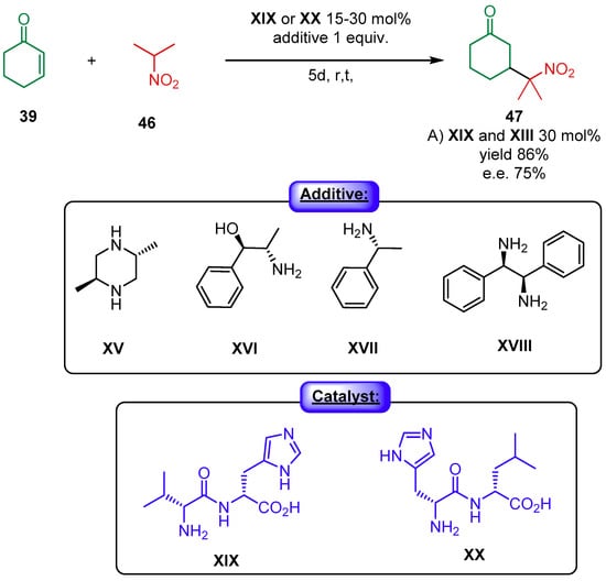 Usually a catalyst that exploits only hydrogen bonds to activate the reagents is not enough to establish the required stereocontrol; in fact, in general, an additional chiral catalyst or a bifunctional catalyst is needed. For example, Tsogoeva et al. reported the use of chiral diamino-compounds (XV–XVIII) as stoichiometric additives, besides a dipeptide catalyst (XIX–XX), to increase the efficiency of a conjugate addition of 2-nitropropane 46 to 2-cyclohexen-1-one 39 (Scheme 18).