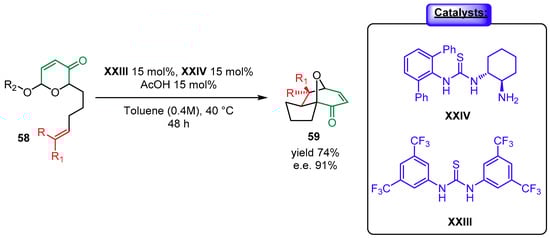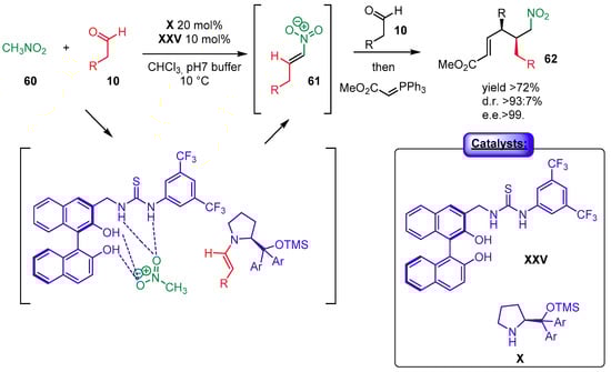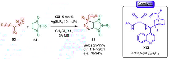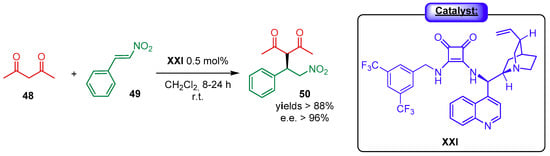 A related group of bifunctional catalysts is the squaramide-derived one, introduced by Rawal. Thanks to the higher efficiency shown, this type of catalyst is proving increasingly successful (Scheme 19) []. Moreover, thiosquaramides show superior performance compared to thioureas, as described by Wheeler and et al. [].