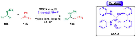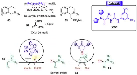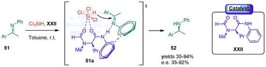 Hydrogen bonding is very relevant in biological systems for several reasons; indeed, the architecture of hydrogen bonding bifunctional catalysts is inspired by the interactions within the cavity of enzymes. For example, Malkov reported an interesting study about the activation of two reagents by dipeptide-derivatives XXII in an enantioselective reaction of ketimines 51 using trichlorosilane. The complementarity between the reagents and the “catalytic site”, along with the weak interaction established, recalls an enzyme. In the transition state 51a, three non-covalent contacts are established between the catalyst and the two reagents, two hydrogen bonds and one π-π interaction (Scheme 20), thus emphasizing the importance of non-covalent bonds []. Therefore, synergistic activations that exploit the hydrogen bond can help when weak interactions are not enough for successful activation.
