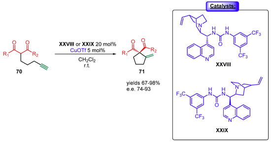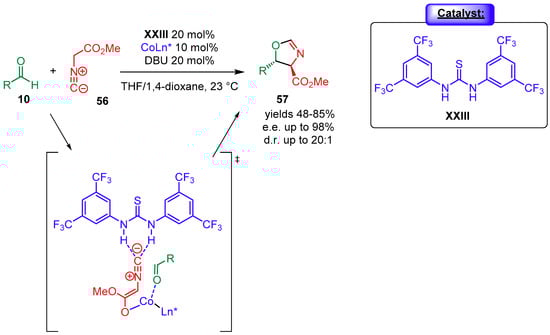 Bifunctional catalysts tend to be widely used since the spatial proximity of the catalytic units, generating two types of interaction with the reagents, may promote a controlled transition state giving rise to high enantioselectivity. Jacobsen et al. reported ground-breaking examples in the area, with chiral thiourea bifunctional catalysts []; it was established that the presence of two m-CF3 groups on the aromatic ring improves the efficiency of the reaction [,,].