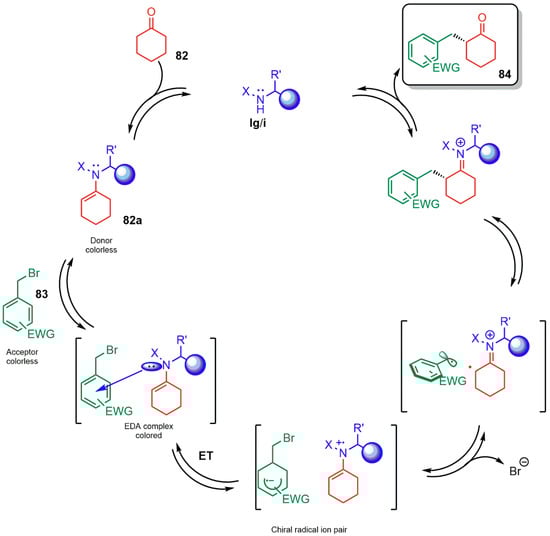 - Arceo, E.; Jurberg, I.D.; Álvarez-Fernández, A.; Melchiorre, P. Photochemical activity of a key donor-acceptor complex can drive stereoselective catalytic α-alkylation of aldehydes. Nat. Chem. 2013, 5, 750–756. [Google Scholar] [CrossRef]