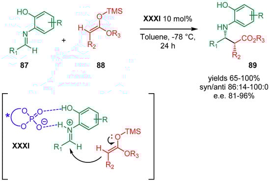 - Akiyama, T.; Itoh, J.; Yokota, K.; Fuchibe, K. Enantioselective Mannich-type reaction catalyzed by a chiral Brønsted acid. Angew. Chem. Int. Ed. 2004, 43, 1566–1568. [Google Scholar] [CrossRef]