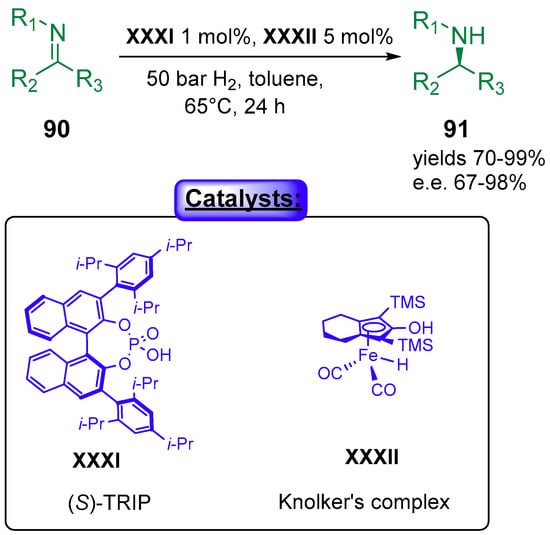 - Zhou, S.; Fleischer, S.; Junge, K.; Beller, M. Cooperative transition-metal and chiral Brønsted acid catalysis: Enantioselective hydrogenation of imines to form amines. Angew. Chem. Int. Ed. 2011, 50, 5120–5124. [Google Scholar] [CrossRef]