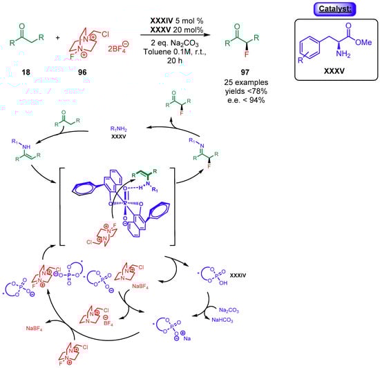- Yang, X.; Phipps, R.J.; Toste, F.D. Asymmetric fluorination of α-branched cyclohexanones enabled by a combination of chiral anion phase-transfer catalysis and enamine catalysis using protected amino acids. J. Am. Chem. Soc. 2014, 136, 5225–5228. [Google Scholar] [CrossRef]