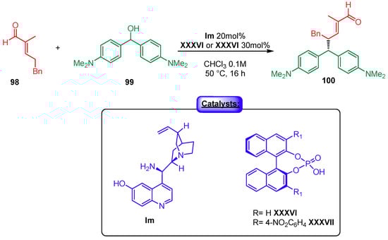 - Bergonzini, G.; Vera, S.; Melchiorre, P. Cooperative organocatalysis for the asymmetric γ alkylation of α-branched enals. Angew. Chem. Int. Ed. 2010, 49, 9685–9688. [Google Scholar] [CrossRef]