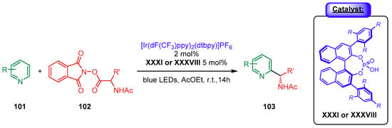 - Proctor, R.S.J.; Davis, H.J.; Phipps, R.J. Catalytic enantioselective Minisci-Type addition to heteroarenes. Science 2018, 360, 419–422. [Google Scholar] [CrossRef]