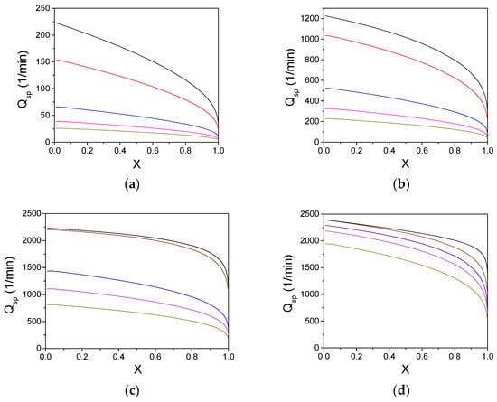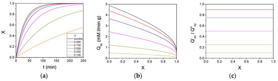 A decreasing reaction rate can be observed in Figure 1a as a function of the EF values. The higher reaction rate was for the soluble enzyme, while it was lower for the immobilized enzyme cases. Figure 1b was obtained by calculating the specific productivity and plotting it against the conversion (not the reaction time). This is a very important step in the methodology because the normalization of the productivity was executed. The results clearly show that the productivity decreased as a function of the mean integral EF. Figure 1c is the result of calculating the ratio of the immobilized and soluble enzymes’ specific productivities. The result is a constant value which is independent of the conversion and consists of the mean integral EF. This is valid for the first-order reaction according to the model proposed by Jurado et al. [29], where the EF is independent of the substrate(s) and product(s) concentrations. This case is a demonstrative example, because the productivity ratio between the immobilized and soluble enzymes as a function of conversion is exactly the mean integral EF, as established in Equation (15).