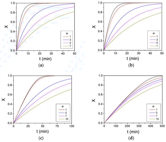 Reaction progress for the hydrolysis of penicillin G by soluble (black line) and immobilized PGA (color lines) for catalysts with different initial PenG concentrations (S0/KM) and Thiele moduli (Φ): (a) S0/KM = 0.1; (b) S0/KM = 1.0; (c) S0/KM = 10; (d) S0/KM = 100.