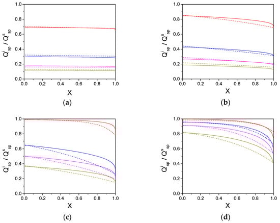 Specific productivities for the hydrolysis of penicillin G by soluble (black line) and immobilized PGA (color lines) for catalysts with different initial PenG concentrations (S0/KM) and Thiele moduli (Φ): (a) S0/KM = 0.1; (b) S0/KM = 1.0; (c) S0/KM = 10; (d) S0/KM = 100. All specific productivities were calculated from data in Figure 2. Legends are the same as those in Figure 2.