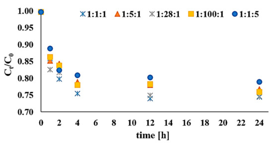 Studies of reagent dose in relation to DEHP distribution in a solid matrix involved DEHP:H2O2:Fe3+ molar ratios of 1:1:1, 1:5:1, 1:28:1, 1:100:1, and 1:1:5, at constant DEHP content equal to 0.13 mM/kg d.w., for times equal to 1, 2, 4, 12, and 24 h, at pH = 3. The results of these tests are presented in Figure 1.