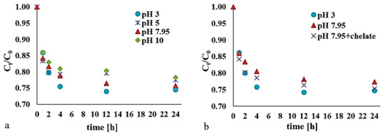 The process was investigated in a reaction environment with pH values of 3, 5, 7.95, or 10, where the dose of hydrogen peroxide was equal to 0.13 mM/kg d.w., and the amount of catalyst was set at 0.13 mM/kg d.w., with t = 1, 2, 4, 12, and 24 h (Figure 2a).