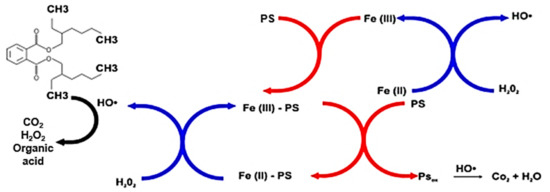Di(2-ethylhexyl) phthalate is an organic compound from the group of phthalic acid esters (PAEs), which are regarded as hazardous, given their capacity to cause genetic aberrations, affect reproduction and further development negatively, and give rise to endocrine disorders [9,10,11]. DEHP is the most common compound of the phthalate group to pollute the natural environment, and its low level of solubility in water combines with its unfortunate stability in the environment to ensure accumulation in bottom sediments, where the content may even reach 322 mg/kg d.w. Its high content in the aquatic environment is associated with leaching from plastics, and in particular from microplastics, where it acts as a plasticizer [9,12]. This phenomenon accounts for the urgency of the search for means of degradation, including the modified Fenton process detailed here.
