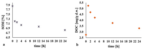 Impact of the H2O2/Fe3+ process (H2O2:Fe3+ 1:1, pH = 3) on (a) soil organic matter (SOM) depending on t; (b) dissolved organic carbon (DOC) depending on t.