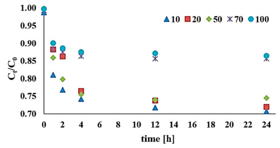 The impact of the initial content of DEHP on the efficiency of removal from bottom sediments was as presented in Figure 5. C0 was analyzed across the 10–100 mg/kg d.w. range, while reaction environment conditions were pH = 3, DEHP:H2O2:Fe3+ 1:1:1, and reaction time in the range 1–24 h.