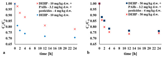 A further important factor found to determine the efficiency of DEHP removal from bottom sediments via the above process was the presence of selected PAH-group contaminants at 3.2 mg/kg d.w., and of pesticides at 4 mg/kg d.w. (for C0 = 10 and 50 mg/kg d.w.) (Figure 6). The efficiency of removal of di(2-ethylhexyl) phthalate in the presence of other impurities was lower by a maximum of 16.32% for C0 = 10 mg/kg d.w. (t = 1 h) (Figure 6a). Where the initial DEHP content was higher (at C0 = 50 mg/kg d.w.), no significant differences in obtained values were observed (Figure 6b).
