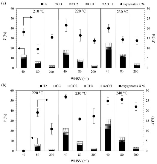 At 4.5 MPa (Figure 1b), the trend in the total conversion of oxygenates with the increase in temperature and WHSV is the same as at 3.2 MPa. Similarly to those results (at 3.2 MPa), the oxygenates were mainly converted into H2, CO2, CH4, and AcOH, whose yields increased at higher temperatures and lower WHSV. Hydrogen yields varied between 1% and 4% at 220 °C, between 1% and 16% at 230 °C and between 2% and 22% at 240 °C. The carbon monoxide yield was lower than 0.3% in all the operating conditions and the CO2 yields varied between 0.2% and 3.1%, and the formation was promoted with the increase in temperature, especially at lower space velocities. The alkanes detected in the gaseous stream were CH4, C2H6 and C3H6. Methane yields were lower than 1.1%, whereas C2H6 and C3H6 were observed in negligible amounts (below 0.1%) regardless of the temperature and WHSV. Acetic acid was the only significant liquid product with yields between 1% and 2% at 220 °C, 1% and 4% at 230 °C, and between 1% and 5% at 240 °C.