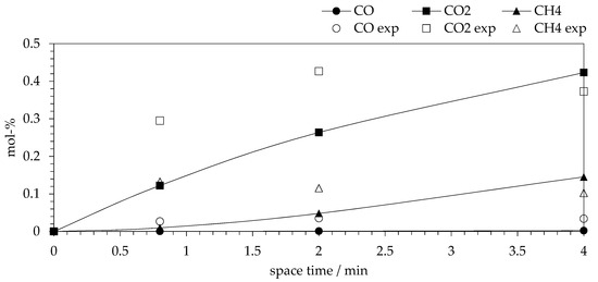 The fit of experimental and calculated gas concentration at different space-times (Figure 5 and Figures S8–S12) indicate some systematic deviations. The model typically underestimated concentrations of CO2 and CO. The fit of the model for CH4 was better; however, there are some systematic deviations in the shape of the CH4 model prediction curve compared to the experimental data. In summary, the model fit was mainly based on the liquid phase data. However, it was relevant to include gas phase data to the parameter fitting e.g., in order to obtain a correct CO/CO2 ratio that indicated rapid WGS reaction.
