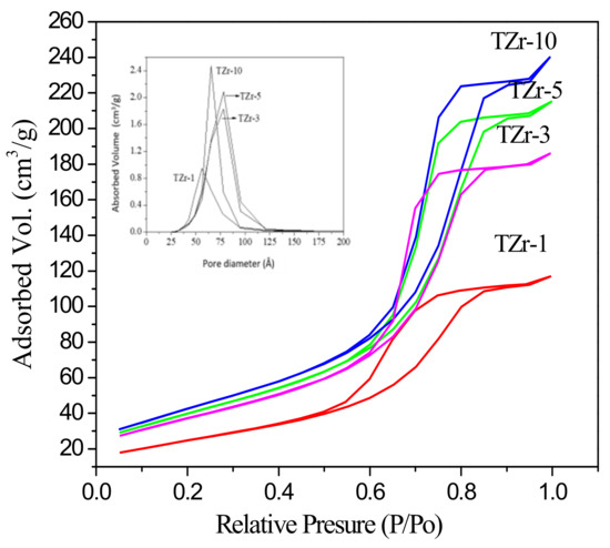 The specific surface areas of catalysts after calcination at 500 °C for 5 h are reported in Table 1. A clear increase in area is observed when zirconium is augmented until the TZr-5 sample and a slight decrease was noticed for TZr-10. The largest area (157 m2/g) was determined for TZr-5. Figure 2 shows the isotherms of the metal oxides after calcination which correspond to type IV and H1 hysteresis. The synthetised solids are mesoporous materials with uniform porosity. An insert in Figure 2 shows that the solids present a narrow pore size distribution. According to the zirconium content, the mean pore size increases as the zirconium content augments, reaching a maximum and then decreases for TZr-10 (Table 1).