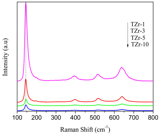 Raman spectra of the Ti–Zr oxides with various loadings of zirconium are presented in Figure 4. The Raman active mode signals at 145, 395, 513, 640 cm−1 and a small shoulder at about 198 cm−1 are characteristic of the anatase crystalline phase [18]. The signal at about 513 cm−1 is comprised of two overlapped peaks [19]. The broadening of the peaks increased as the zirconium content augmented but no other signals related to ZrO2 were observed. It is expected that the incorporation of Zr into the titania lattice produces a change in the oxygen coordination and, as a consequence, defects could be created in the final structure. Moreover, it is known that the presence of defects in the crystal structure results in the broadening of the Raman modes and in a shift in the positions of the picks of the spectra [20]. The broadening was observed in the present study but not the shift. We believe that widen in the Raman signals result from the incorporation of Zr into that titania lattice. However, it is possible that the broadening could be due to the quantum size effect, present in semiconductors when the crystalline size is less than 10 nm [21,22].