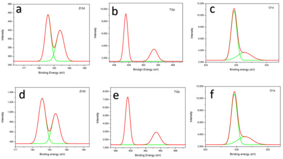 XPS spectra of TZr-1 (a–c) and TZr-10 (d–f) for Zr 3d, Ti 2p and O 1s.