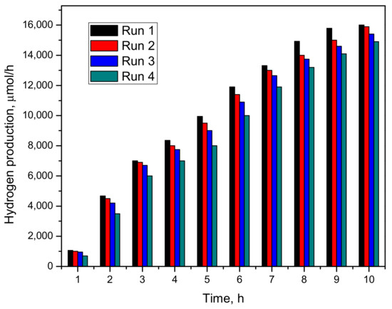 To further study the stability of the TZr-10 catalyst, its photocatalytic activity was monitored during various reaction cycles. After the first run, the catalyst was washed with deionised water, dried for 8 h and calcined during 5 h at 500 °C. The sample was ready again to be evaluated in the generation of hydrogen as a photocatalyst. Following this treatment, the TZr-10 catalyst was tested during 4 cycles, and the measured hydrogen production is reported in Figure 9. The decrease in photocatalytic activity was probably due a change in the physicochemical properties of the sample resulted after consecutive calcinations.