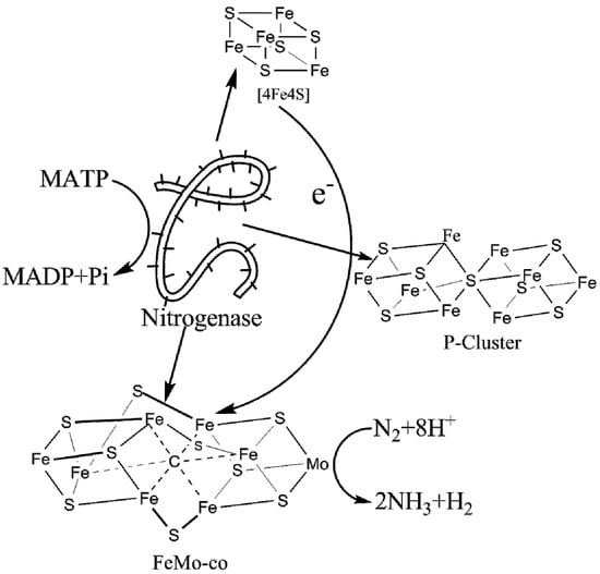 Nitrogenase is the only known biological system that has the capability of reducing atmospheric N2 to NH3 [21]. The Fe-proteins and the MoFe-proteins of nitrogenase together catalyze the reduction of N2 to NH3 with an ideal reaction stoichiometry [22]: