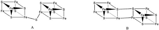 Cluster: (A) [Fe4S4]–(μ-S)–[Fe4S4] and (B) edge-bridged [Fe4S4]–[Fe4S4].