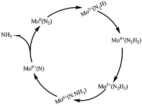 Figure 4 shows that a molybdenum complex can convert N2 to NH3 only when the Mo oxidation states are more than III. Moreover, the ligand enclosing the molybdenum ion only permits small reactants such as nitrogen and protons to reach the active site. The system had cycled at least four times with an appropriate proton source and reductant [105]. Evidently, molybdenum can improve binding or protonation of the substrate by changing the electronic structure of FeMo-co.