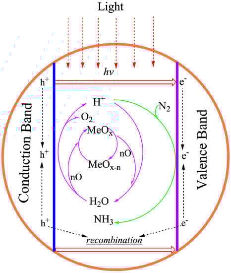 A photo-catalyst is dynamically converted between its oxidized and reduced states in the ammonia production process as shown in Figure 5. In this process, the amount of solar energy should be enough that it is absorbed and converted into the large free energy gain of N2 to NH3 (⊿Gθ = 339 kJ mol−1) [110]. That is to say, the photo-catalyst capable of oxidizing H2O (Equation (4)) can reduce N2 by the photo-formed conduction band (CB) electrons (Equation (5)), producing NH3 from N2 and H2O (Equation (6)) under ambient conditions. Then, the CB position of the photo-catalysts should be more negative than the reduction potential of the N2 hydrogenation; as well, the valance band (VB) should be more positive than the oxygen evolution potential, or the photo-generated holes must also be consumed to satisfy the charge neutrality (CB e− + VB h+ = 0). Necessarily, a large thermodynamic driving force is required to overcome the N≡N band energy barrier for photo-catalytic synthesis of NH3 from N2 in solar light [111].