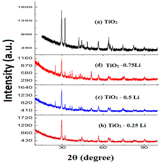 Figure 1 shows the XRD pattern of TiO2 and lithium-doped TiO2. The unmodified TiO2 X-ray diffraction spectra show an excellent match to standard reference code ICDD: 98-015-4607, anatase titania [2]. Briefly, the XRD peaks of the TiO2-0.25Li nanocatalyst provided a constant harmony to reference standard code ICSD: 96947, ICDD: 98-009-6947, lithium titanium oxide (0.03/1/2) whereas TiO2-0.5Li and TiO2-0.75Li showed a good match to standard reference code ICSD: 84713, ICDD: 98-008-4713, lithium titanium oxide (0.74/3/6). The crystallographic factors of the prepared catalysts are summarized in Table 1.