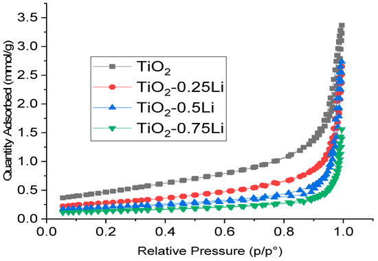 The nitrogen adsorption–desorption measurements were performed to determine the surface area, pore volume, and pore size of TiO2 and lithium-doped TiO2 catalysts. The BET analysis of different catalysts is shown in Table 2. The drop in surface area and pore volume was observed after the impregnation of lithium ions to TiO2. The reduction in porosity in lithium-doped TiO2 was maybe due to the addition of lithium ions in pores. The nanomaterial showed significant catalytic activity with an increase in impregnation of lithium ions; conversely, a drop in surface area and porosity. The rise in catalytic activity was possibly due to the basic strength of catalytic sites in the nanomaterial, which enhances the conversion of WCO to FAME [16,17]. The BET adsorption–desorption isotherm plot for the synthesized catalysts are given in Figure 4. The nature of the isotherm specifies the presence of mesoporous materials.